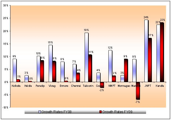 As per our analysis of the latest data available, all major ports with an exception of Kandla port trust has shown a slowdown in traffic. Infact ports like Mumbai Port Trust and Cochin has shown a negative growth rate while ports like Haldia and Ennore have stagnated at FY08 levels. Kandla is expected to emerge as the largest cargo port in India followed by Vizag and JNPT. Infact the half yearly box traffic at JNPT has grown with a moderate growth of 9.9% in FY09. It would be prudent to remember that the same terminal handled around 4.06 million TEUs in FY08 with a growth rate of 23% over previous year.