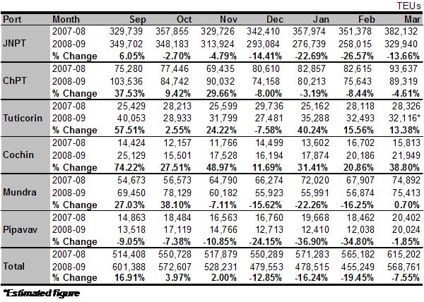 Indian private and public container terminals together handled 7.86 mTEUs of traffic in FY09 vis-?-vis 7.62 mTEUs in FY08, registering a feeble 2.8% growth. It is feared that if the economic downturn continues, the ongoing financial year may turn out to be more disappointing.