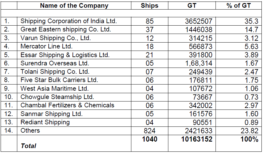 Distribution of Indian Tonnage as on 01.01.2010 to 31.12.2010